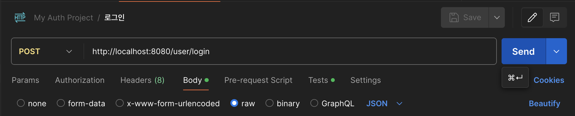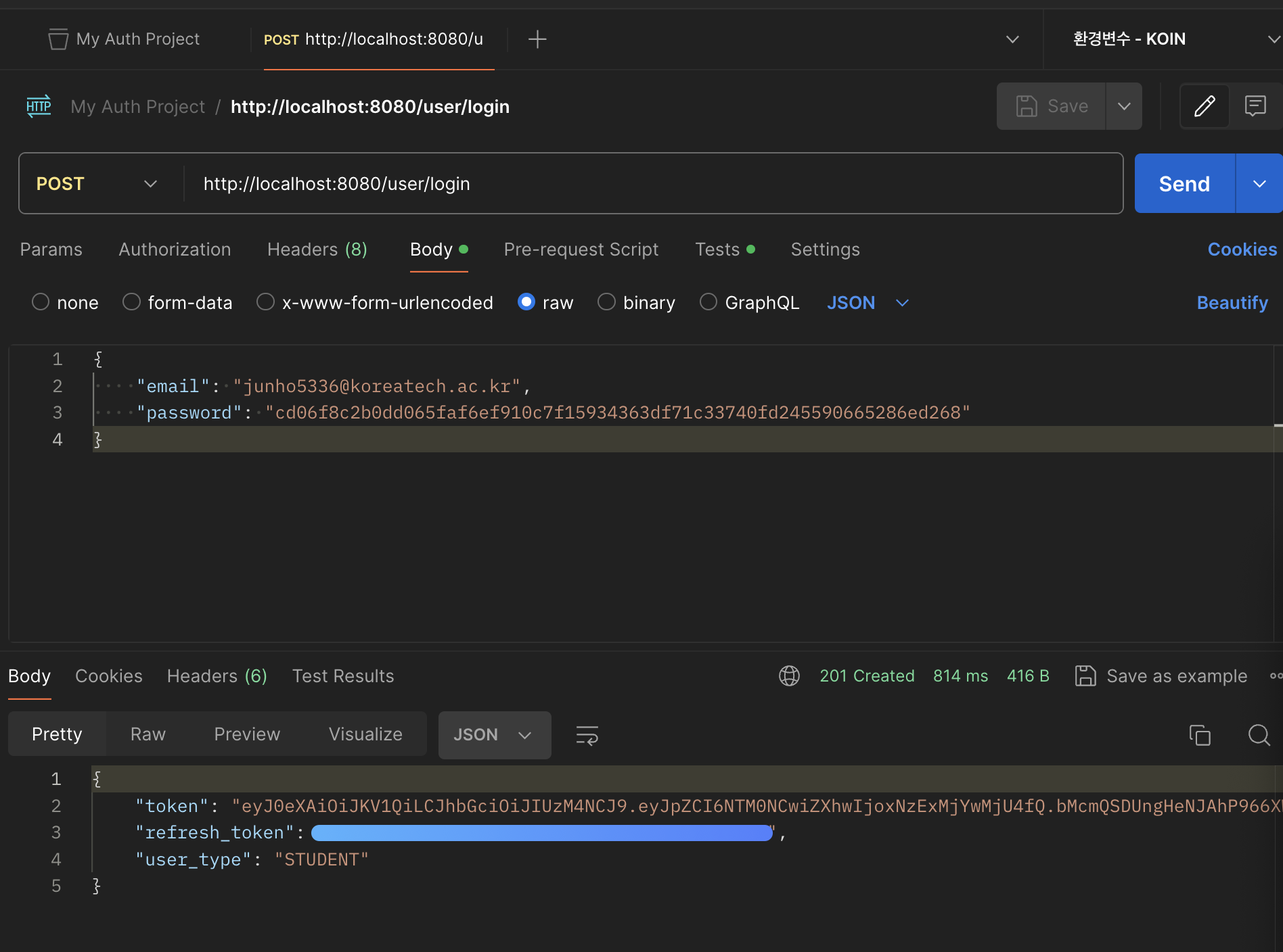 로그인 수행 -> Environment의 login-token 값에 토큰값 저장 (전역)