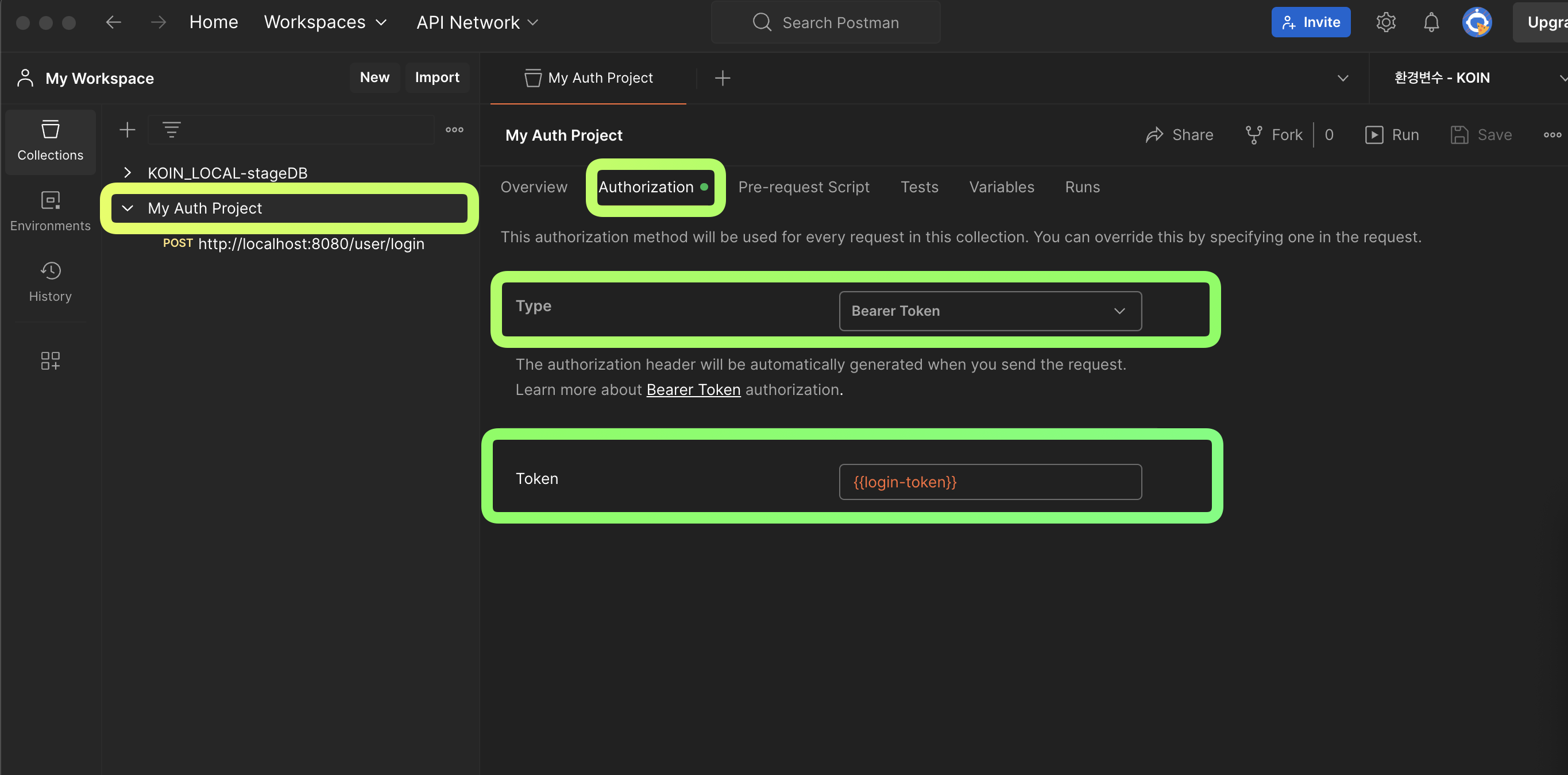 이제 하위 Request는 상위(Collection)에서 사용하는 {{login-token}} 인증방식을 공유받을 수 있다.