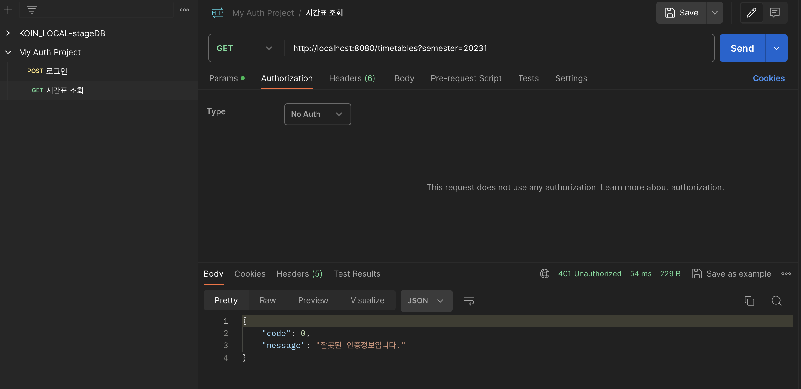 인증값이 없을때는 요청이 정상적으로 수행되지 않음을 확인할 수 있다.