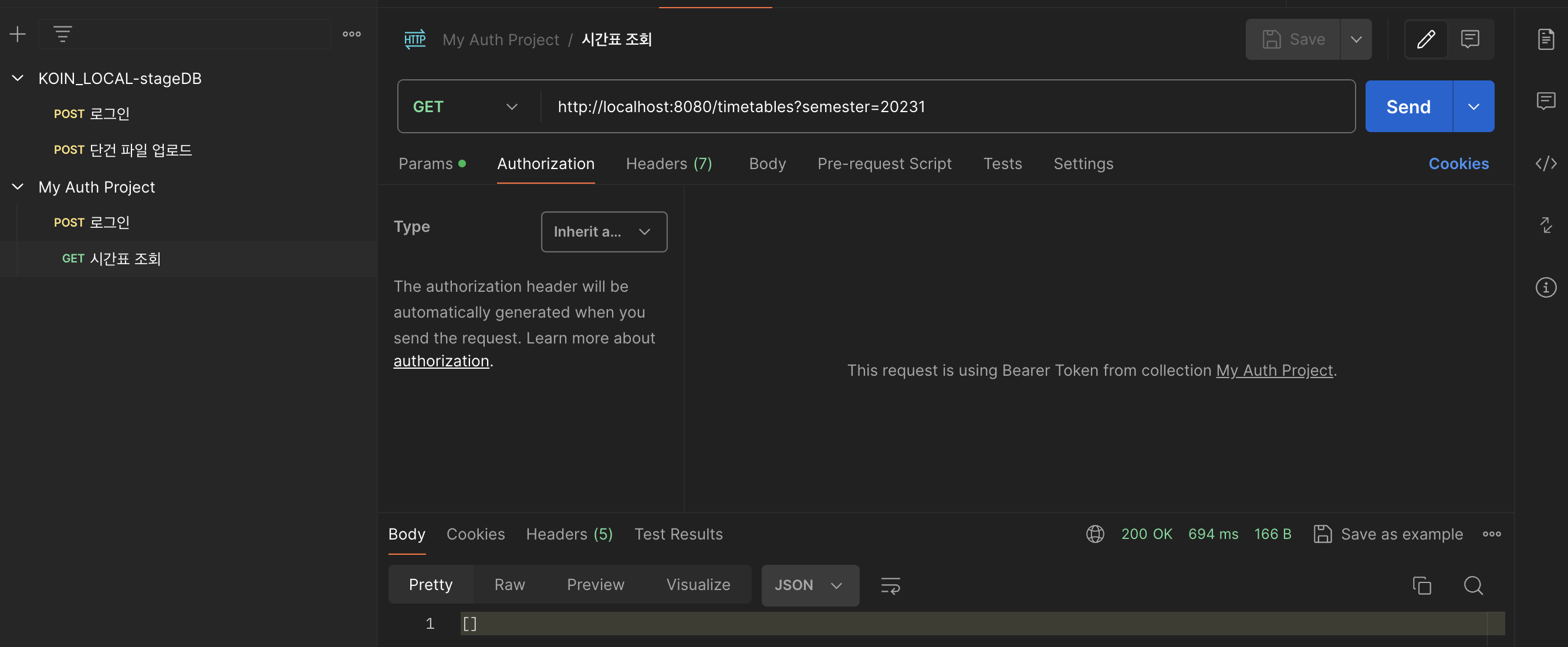 이를 위해 로그인 API 호출 - 반환값에서 토큰값 복사 - Auth 탭에서 토큰 넣고 요청 보내기 이 과정을 모든 job에서 반복해야한다.