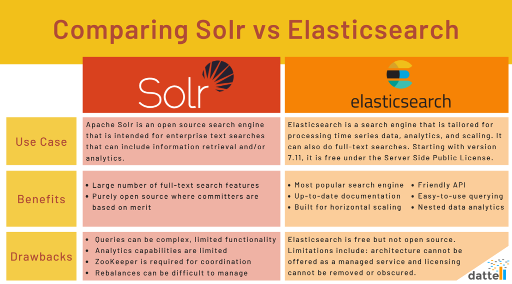 solr는 큰 데이터를 색인하는데 용이하다는 장점이 있고, elasticsearch는 인덱싱 속도가 비교적 빠르다는 장점이 있다.