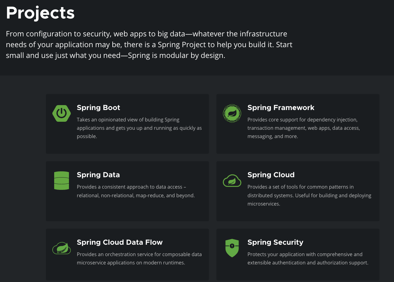 Spring Boot, Spring Framework, Spring Data, Spring Cloud 등등.. 다양한 Spring Project들이 존재한다.