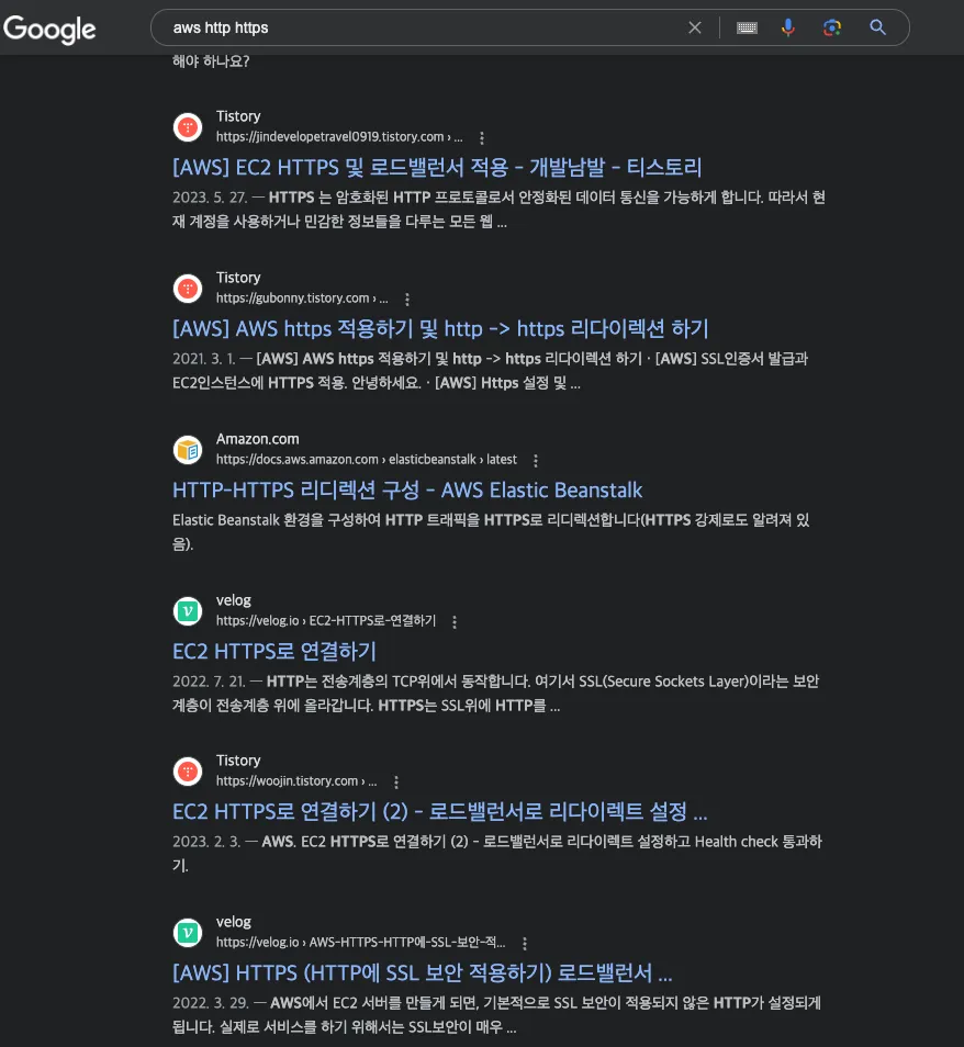 AWS Ec2 환경을 사용중이고, 목표하는 구성은 http -> https 리다이렉트 환경 구성일 것이다. 이에 aws, http, https라는 키워드로 구글링을 하면 다음과 같은 결과들을 얻을 수 있다.