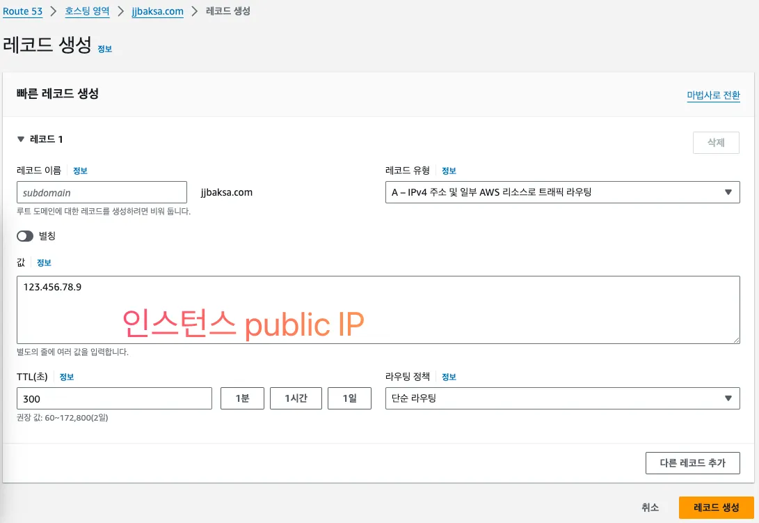 도메인의 A 레코드를 생성한다. 이때 대상 값을 EC2의 퍼블릭 IP로 향하게 구성한다. 이렇게 구성하면 http://도메인.com 주소로 EC2에 접근할 수 있다.