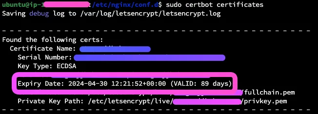 sudo certbot certificates 명령어로 인증서 정보를 확인할 수 있다.