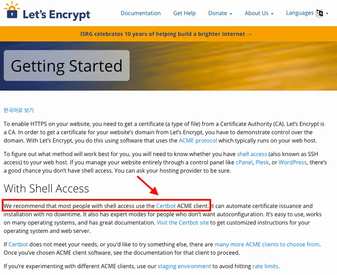 Let’s Encrypt에서는 인증서를 무료로 발급해주고 있고 SSL 인증서 설치 및 환경설정을 편리하게 해주는 Certbots를 제공해준다.