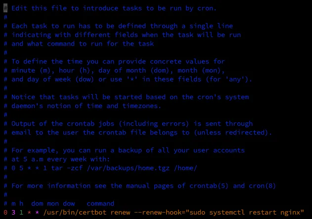 마지막줄에 다음 명령어를 추가해고 저장하면 매월 1일 오전 3시에 인증서가 갱신된다. 0 3 1 * * /usr/bin/certbot renew --renew-hook="sudo systemctl restart nginx"