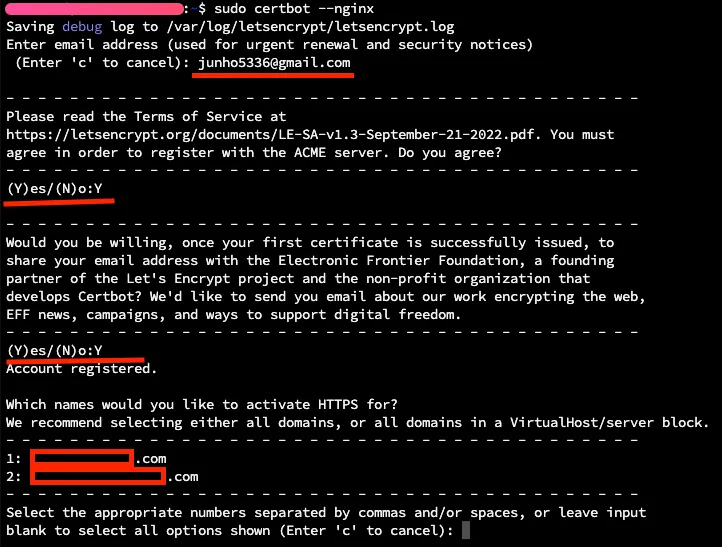 이메일 입력 및 약관동의를 하면 위와같은 화면이 나온다. 우리가 nginx에 선언해둔 server_name에 대한 인증서 발급을 수행한다고 말하고있다.