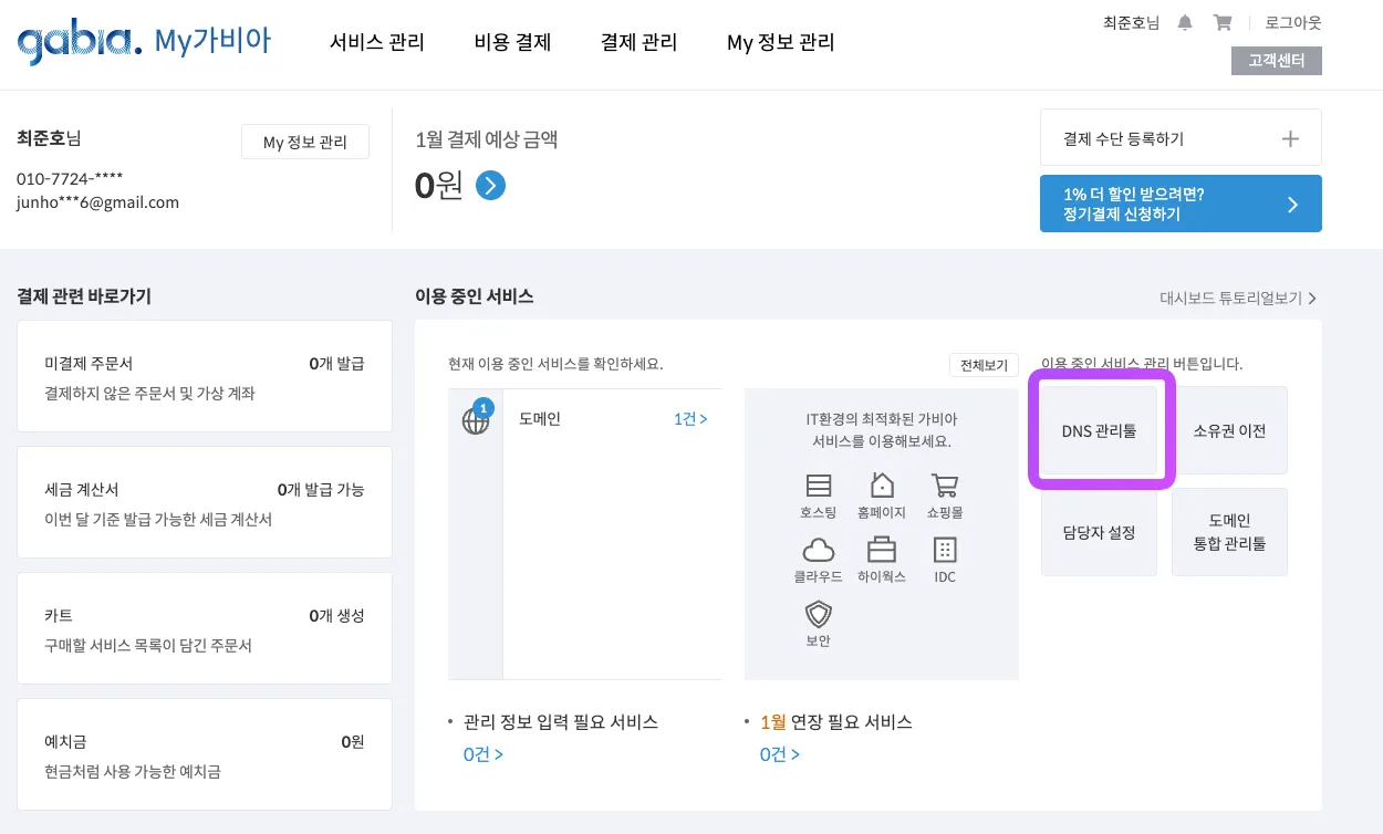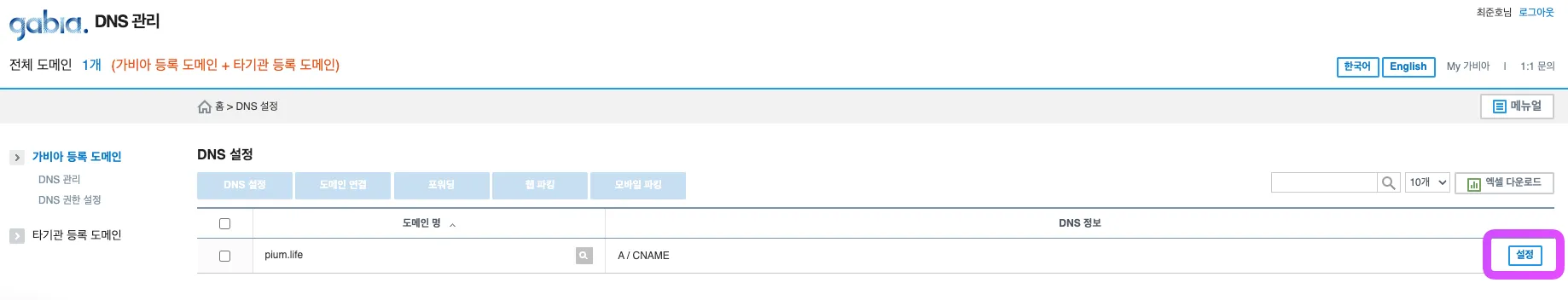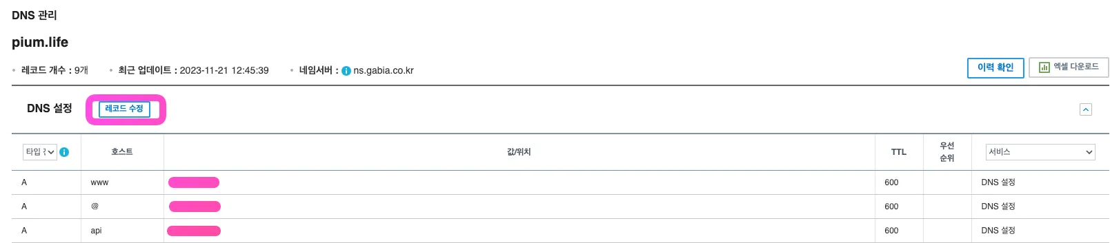 가비아의 경우 DNS 관리 툴 - 설정 - 레코드 수정에 들어가서 도메인 관리 작업을 수행하면 된다.