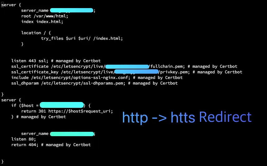 발급이 완료되면 작성했던 파일에 certbot이 SSL 인증서를 적용하는 코드와 http -> https 리다이렉트하는 코드를 적용한 모습을 확인할 수 있다.