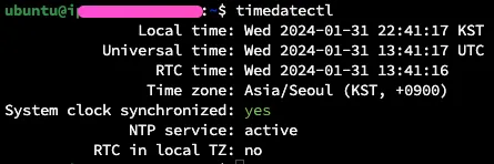 만약 UTC로 설정되어있고 한국 기준으로 맞춰주고 싶다면 다음 명령어를 입력하자. sudo timedatectl set-timezone Asia/Seoul