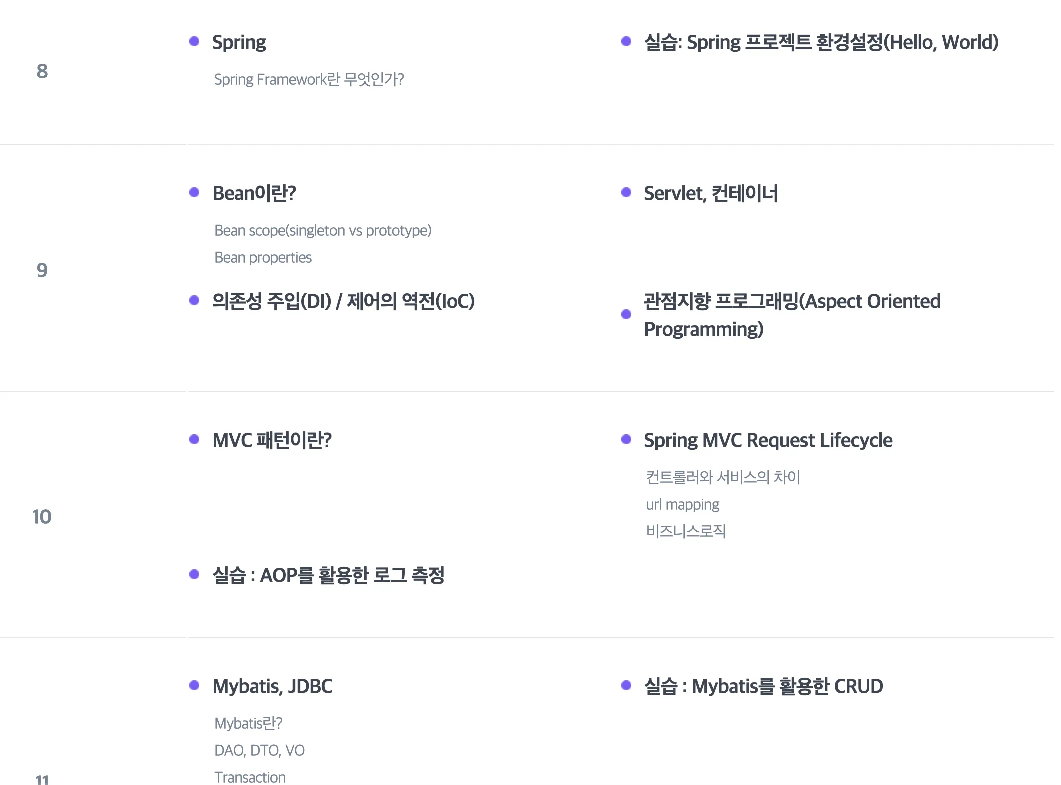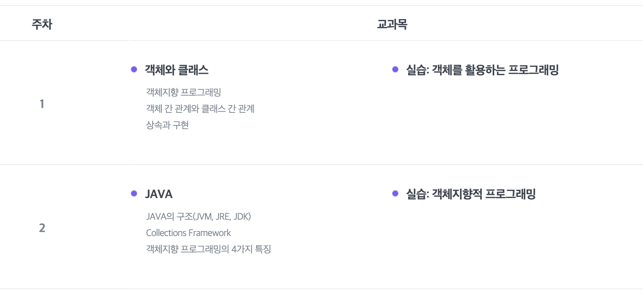 가입 조건에 군필이 있는 경우 교육생이 Java에 대한 기본적인 이해도를 갖춘 경우가 대다수였다. 때문에 커리큘럼 상에 자바 교육이 없었다.