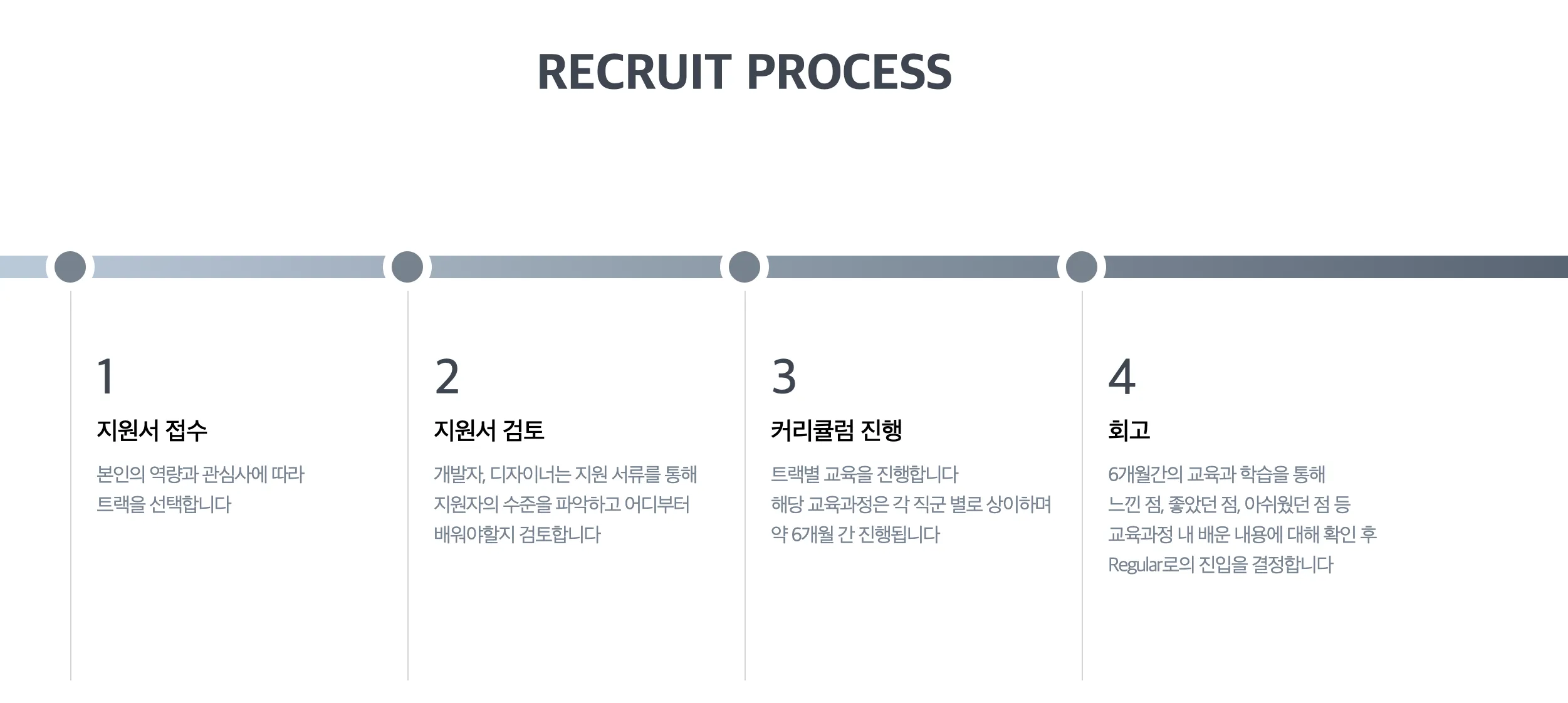 Beginner 교육생들은 6개월간 커리큘럼에 따라 교육을 받고 회고를 통해 Regular로의 전환을 결정하는 프로세스로 모집과정이 진행되고있다.