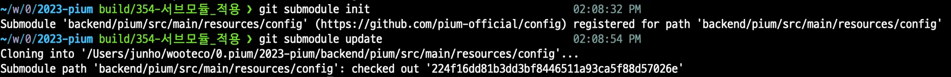 submodule을 초기화하고 update한다. 해당 작업은 처음 1번만 수행하면 된다.