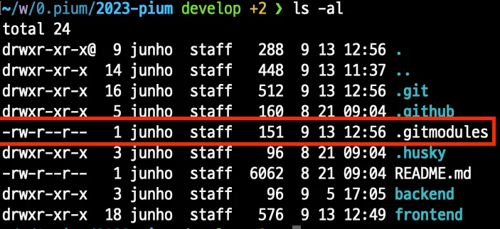 git submodule add 명령어를 수행하면 루트 경로에 .gitmodules 파일이 생성된 것을 확인할 수 있다.