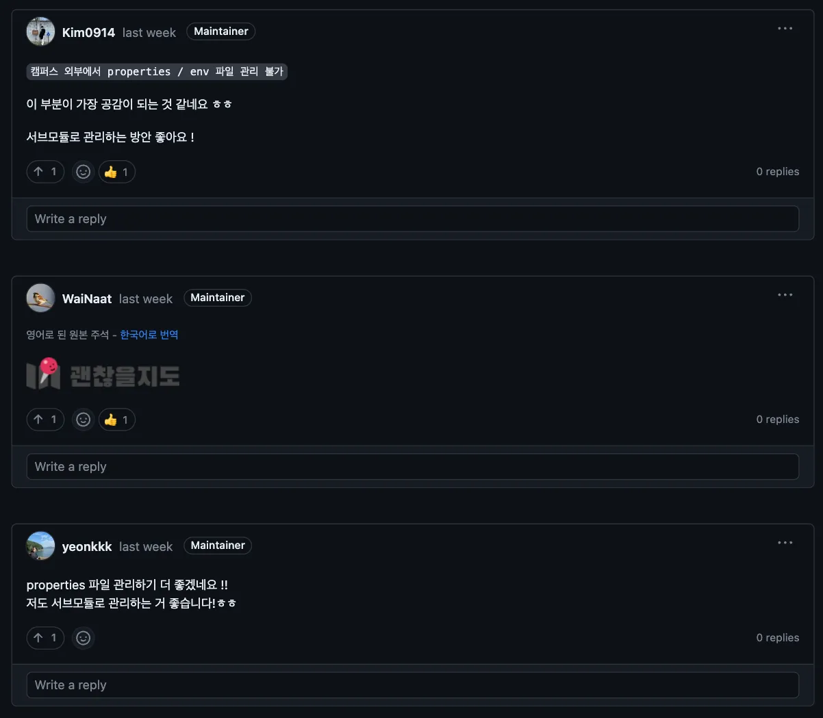- 분업화 진행 간 properties / env 파일 변경에 대한 공유가 어려움