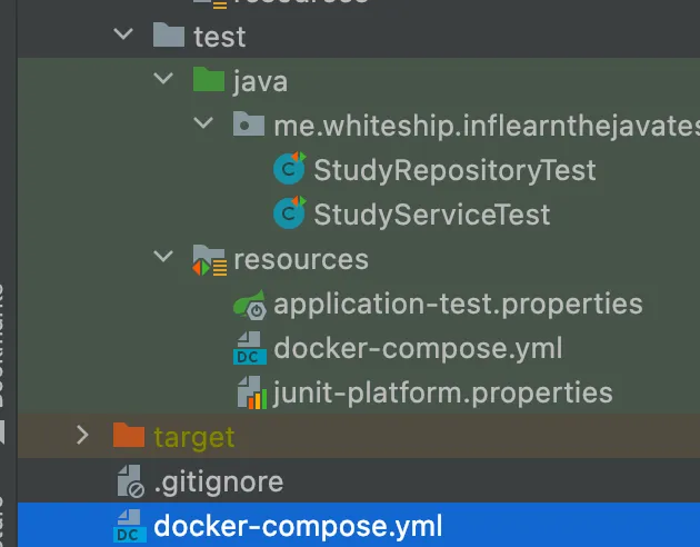위와 같이 프로젝트 최상단에 위치하는 docker-compose 파일(어플리케이션 관련 설정)과 test/resource 경로 내에 위치하는 파일(테스트 관련 설정)에는 한가지 차이가 있다.