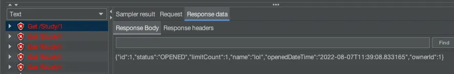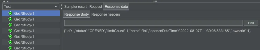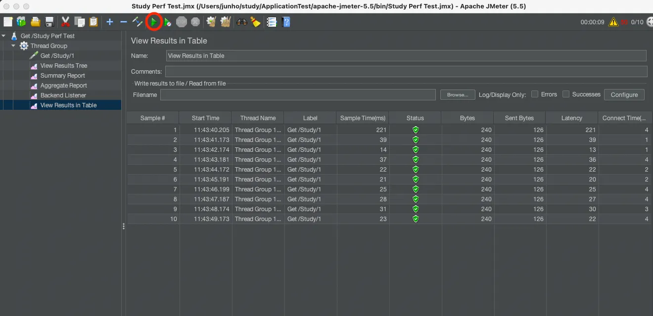 애플리케이션이 구동된 상태로 JMeter를 실행하면 다음과 같이 Listener에 결과가 나온다.