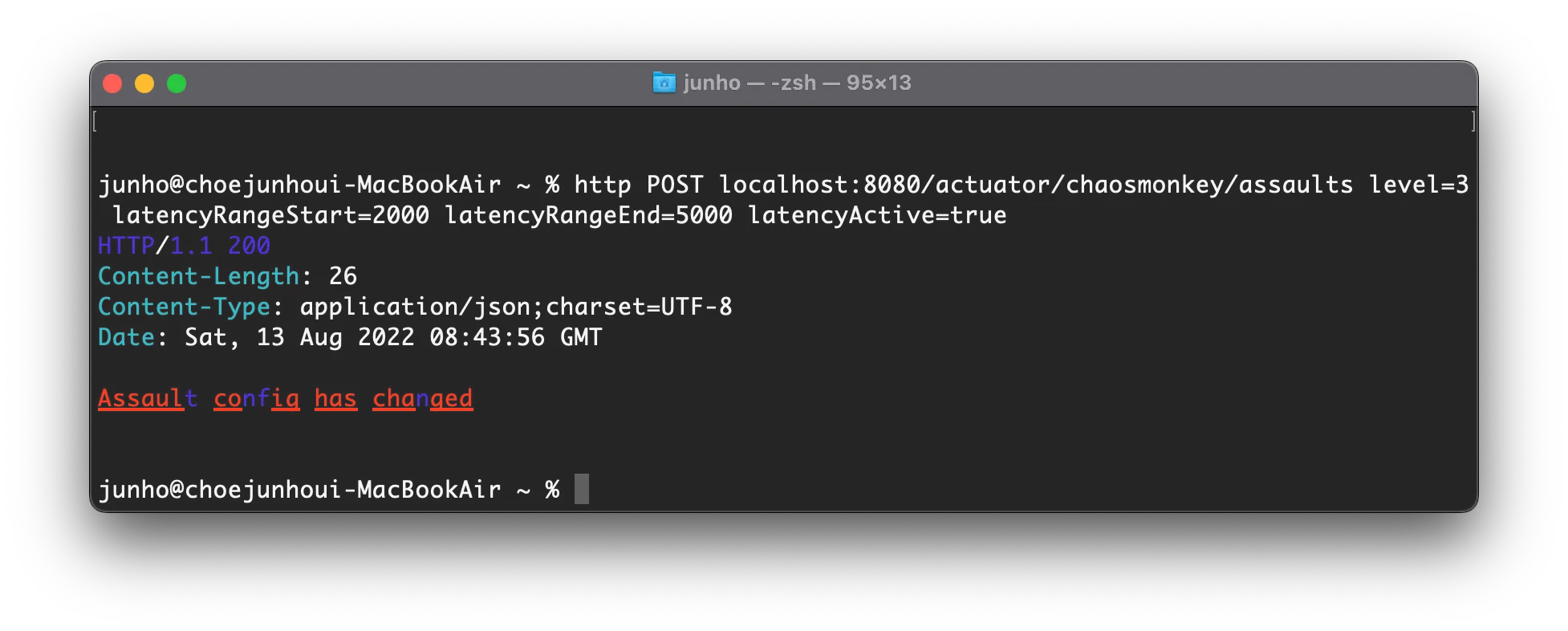 - 지연공격 설정 : http POST localhost:8080/actuator/chaosmonkey/assaults level=3 latencyRangeStart=2000 latencyRangeEnd=5000 latencyActive=true