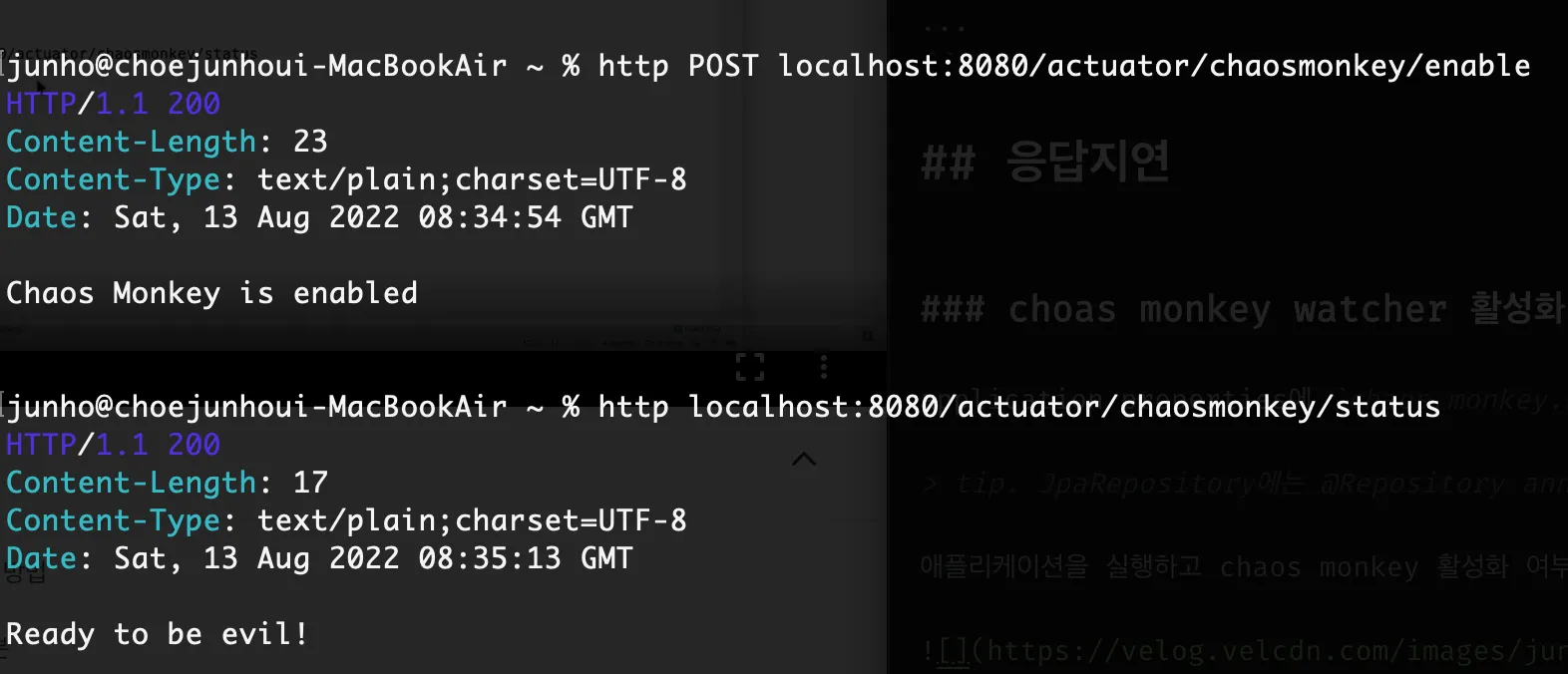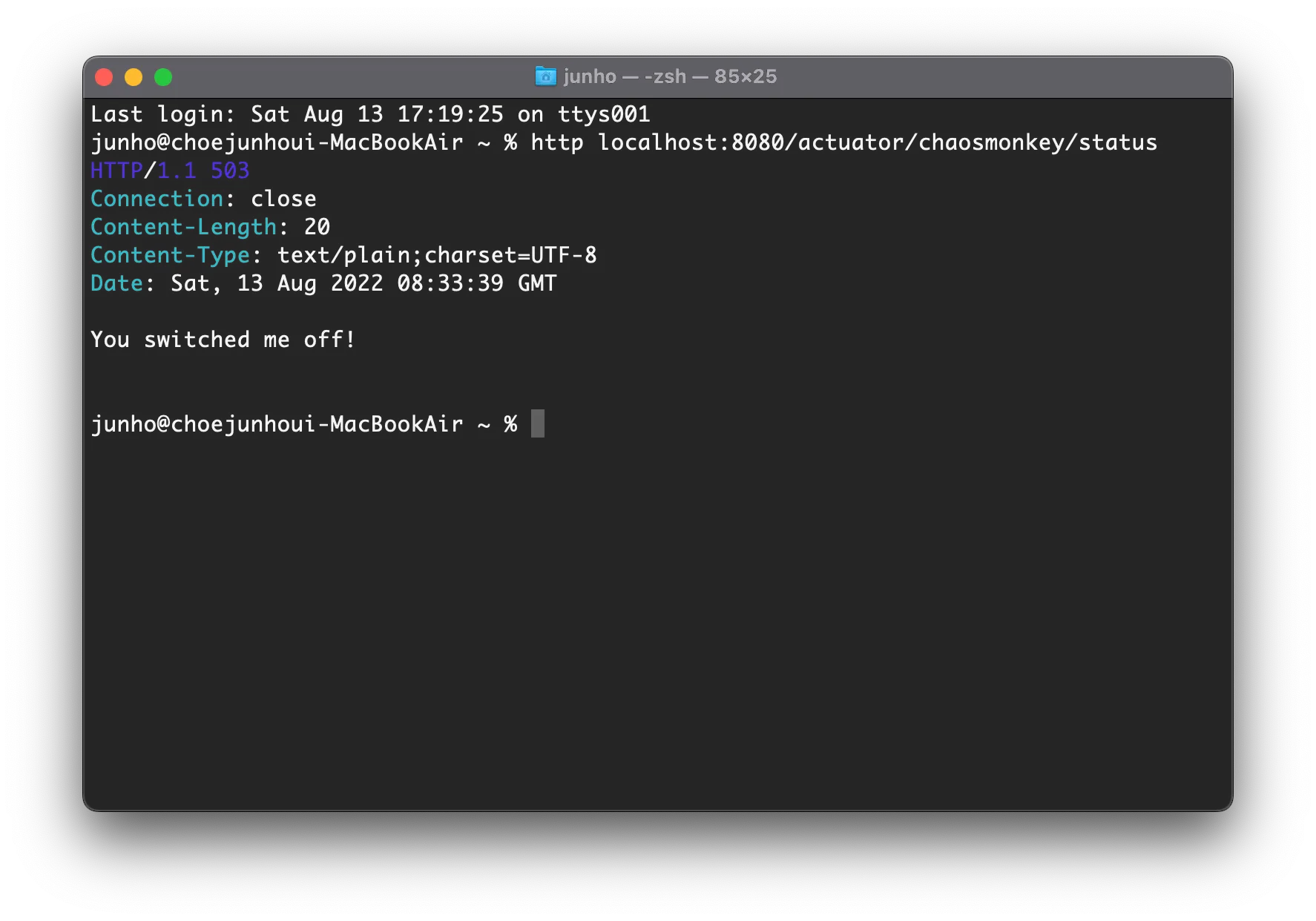 - 상태확인 : http localhost:8080/actuator/chaosmonkey/status