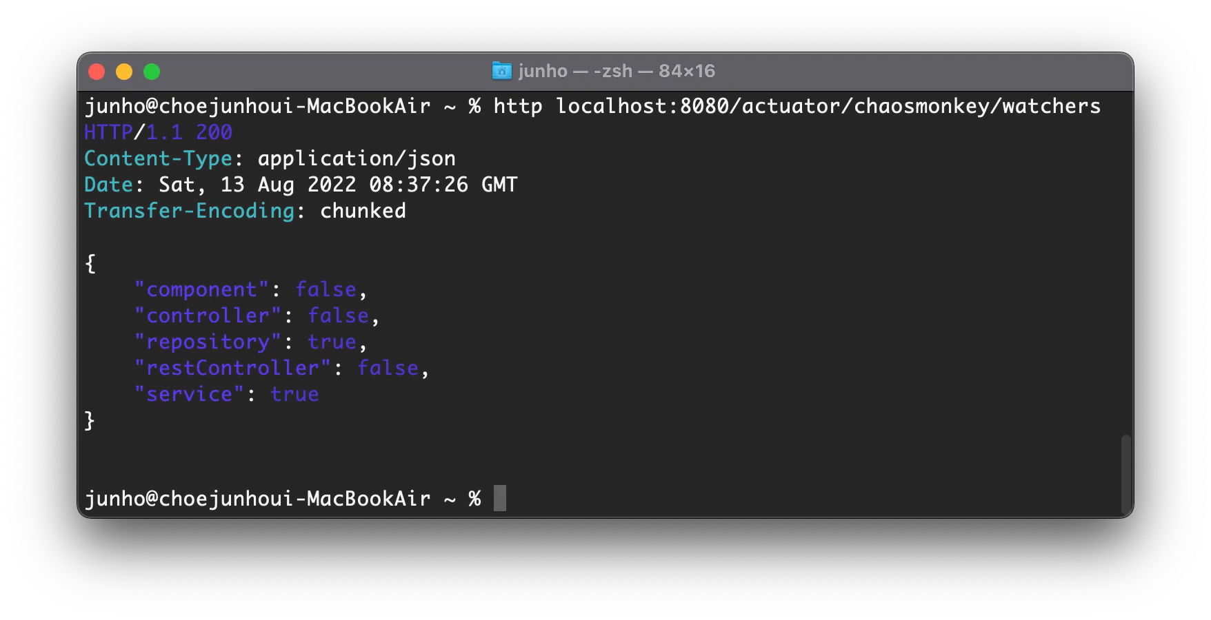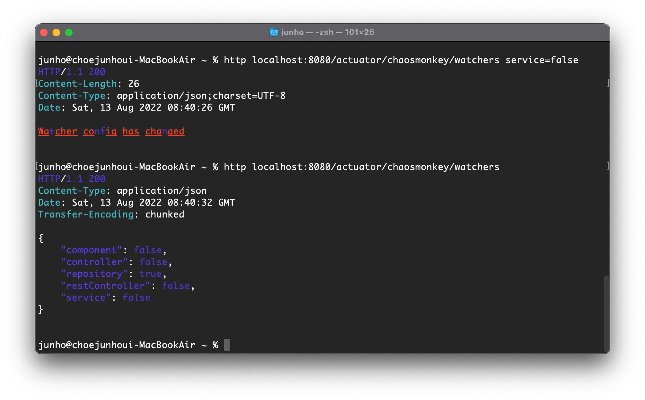 watcher 확인 : http localhost:8080/actuator/chaosmonkey/watchers