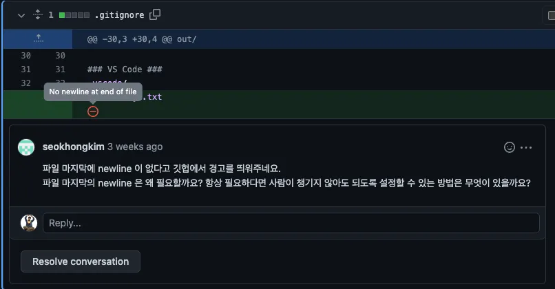 GitHub에서 PR을 제출하면서 마지막줄의 개행이 없다는 경고문을 띄워주는 것을 확인할 수 있었다.