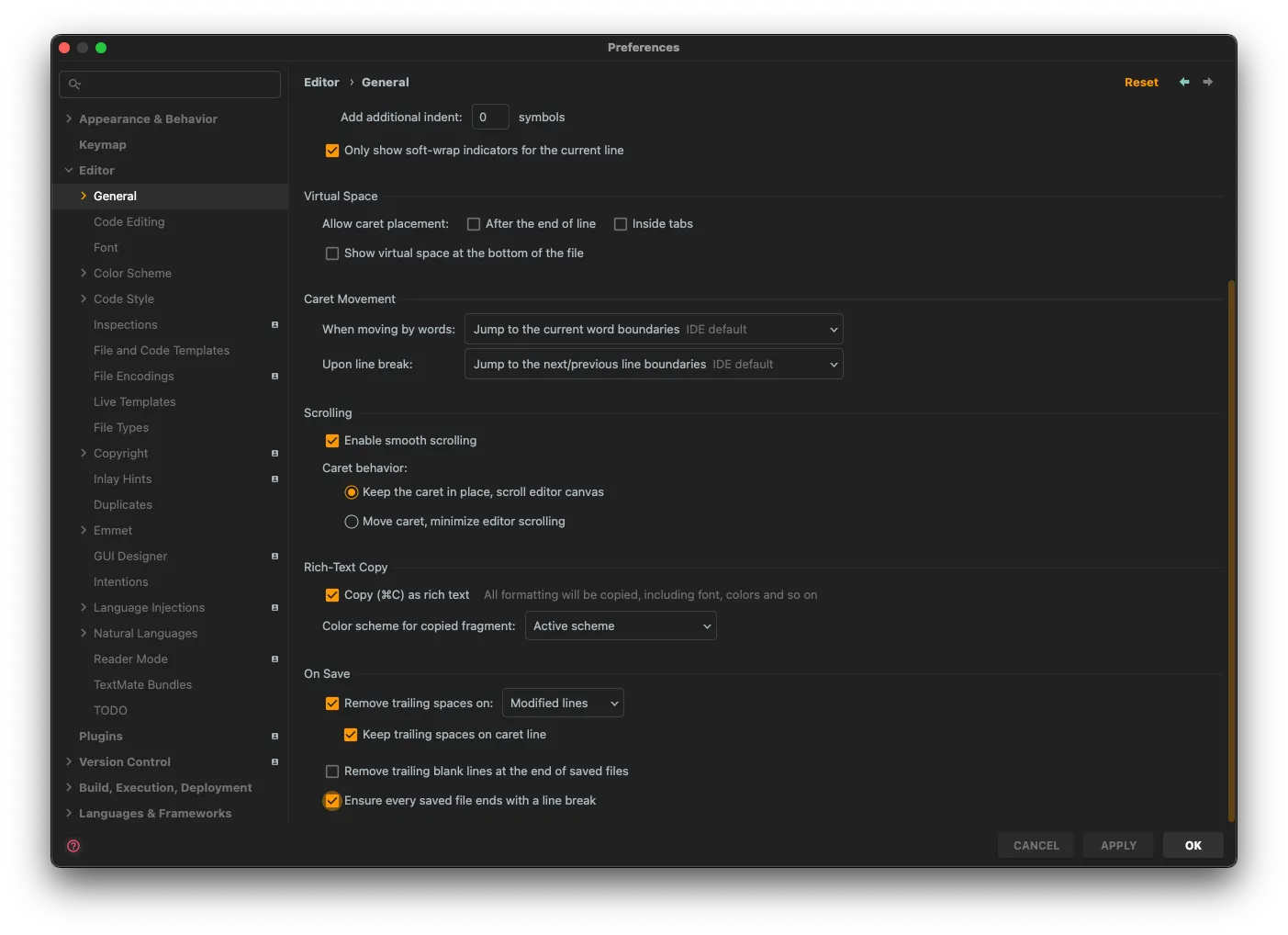위 옵션을 체크해주면 파일 저장 시 파일의 마지막 줄에 개행을 자동으로 추가해준다.