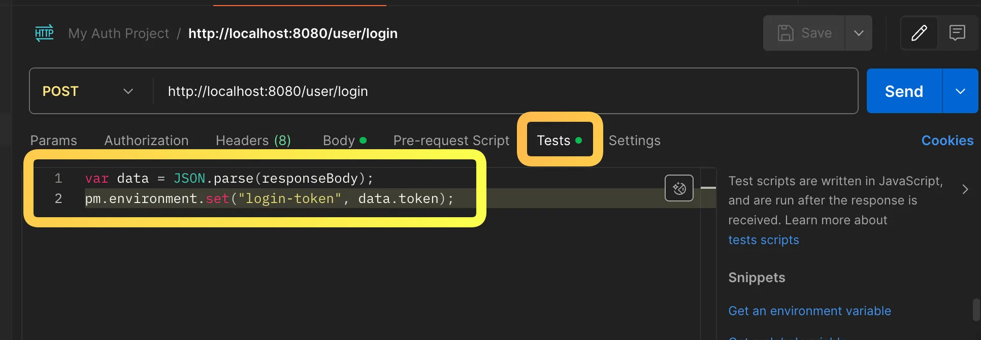 Tests 탭에서 반환되는 값에 대한 조작을 할 수 있다. 아래와 같이 스크립트를 작성하여 전역변수 login-token에 토큰값을 담는다.