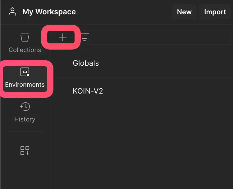 좌측 탬의 Environments 탭에서 환경변수를 설정할 수 있다. 좌측 상단의 + 버튼을 눌러 새로운 환경변수를 생성한다.