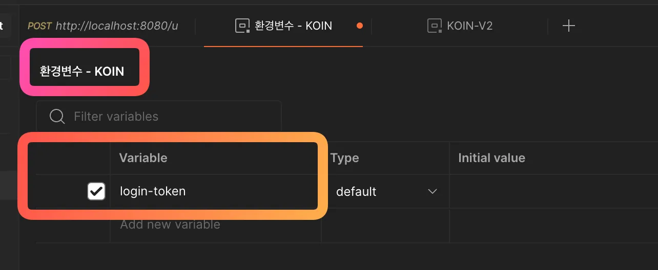 환경변수를 설정하는 탭에서 윗 부분은 환경변수의 이름, 아래 Variable은 변수명을 의미한다. login-token이라는 Variable을 선언해주자.