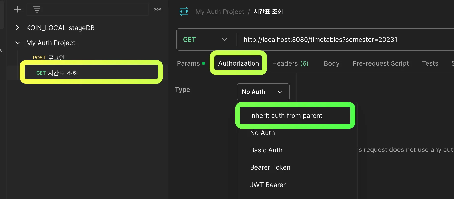 Authorization 탭에서 Authorization Type을 Inherit auth from parent로 설정해준다.