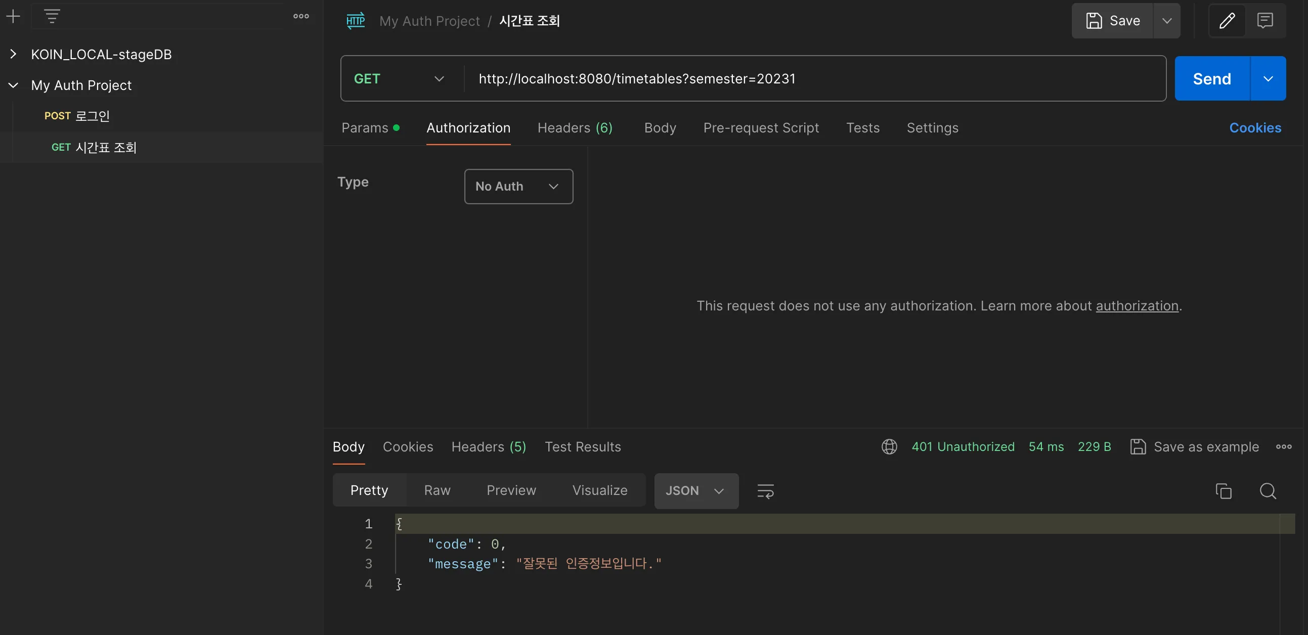 인증값이 없을때는 요청이 정상적으로 수행되지 않음을 확인할 수 있다.