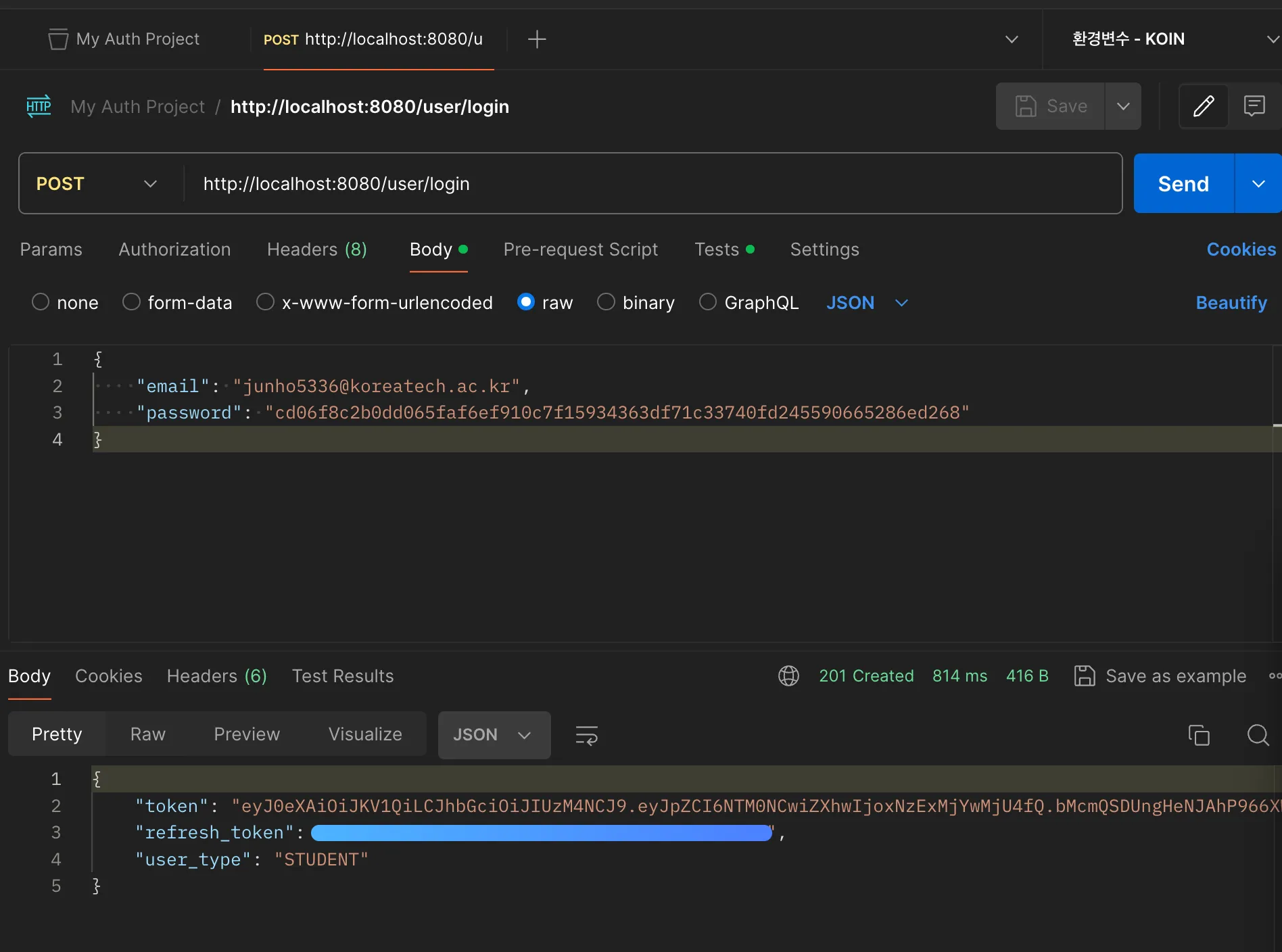 로그인 수행 -> Environment의 login-token 값에 토큰값 저장 (전역)