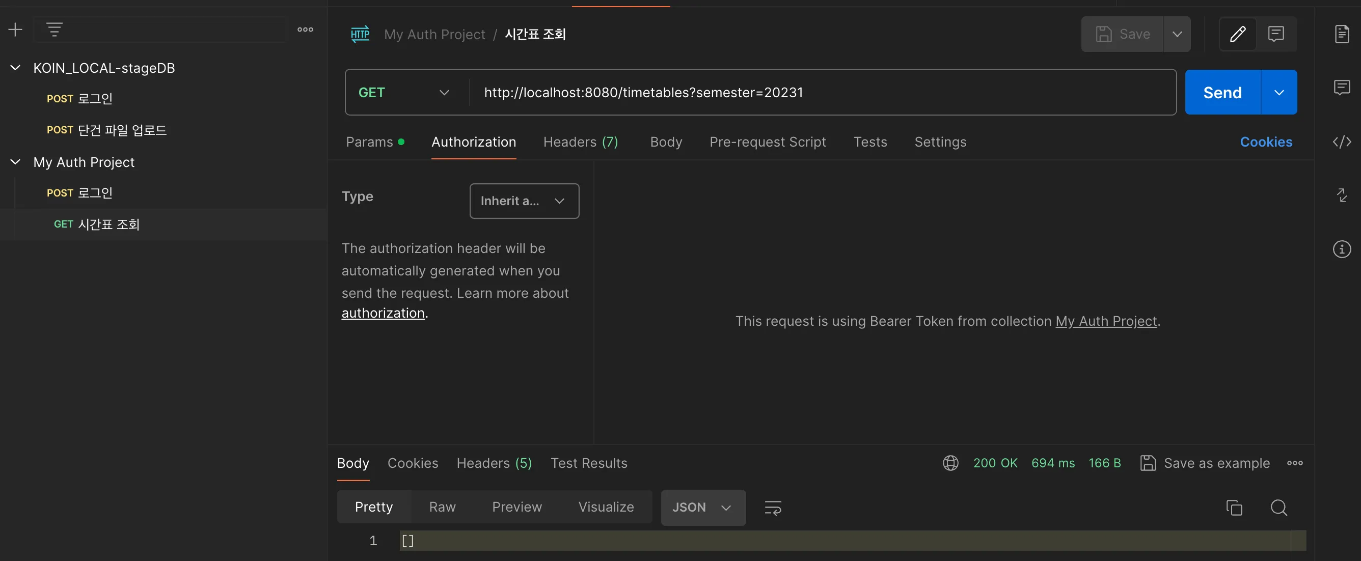 이제 인증이 적용된 요청이 정상적으로 수행되는 모습을 확인할 수 있다.