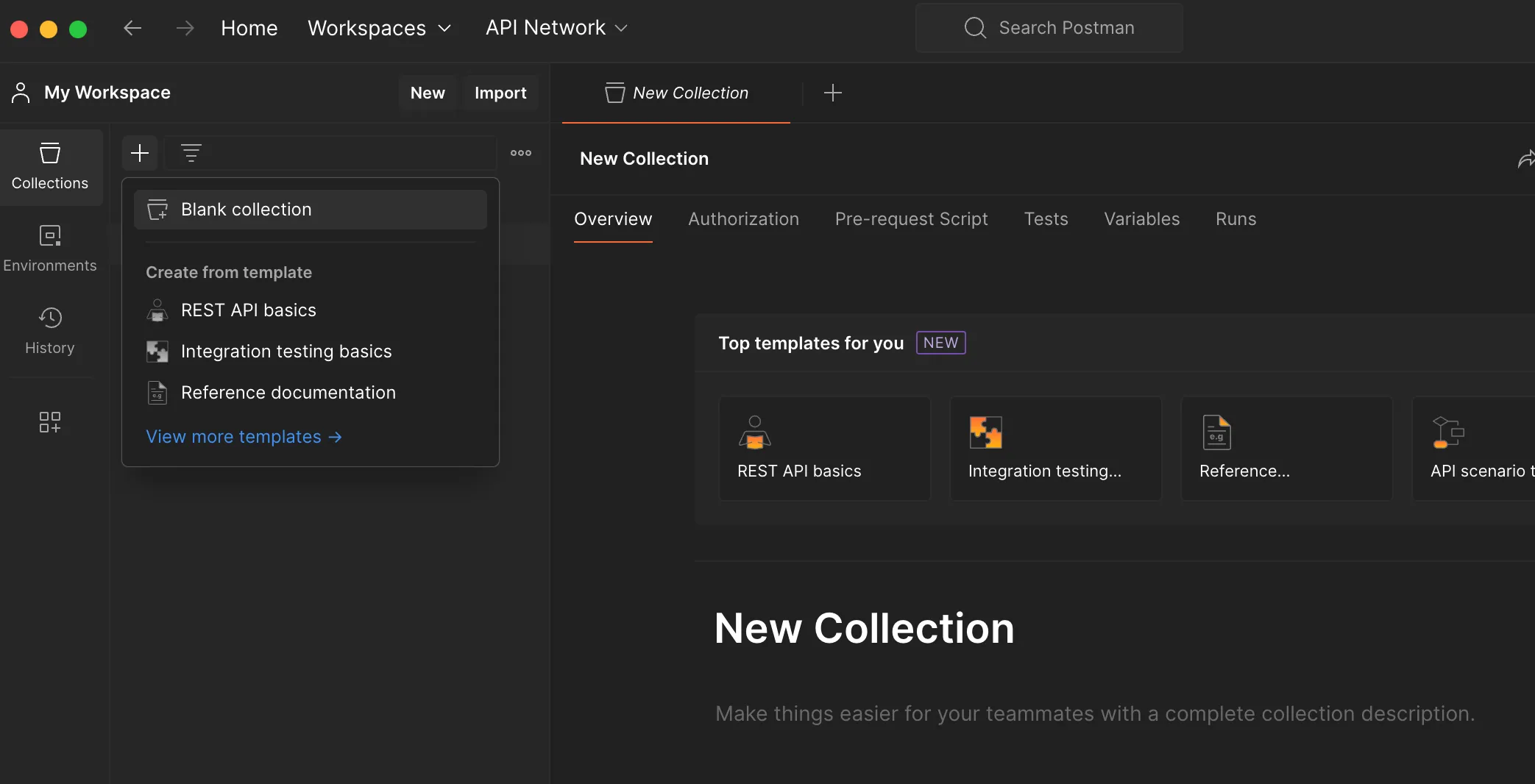 Add request를 눌러 Collection 내부에 request를 생성한다.