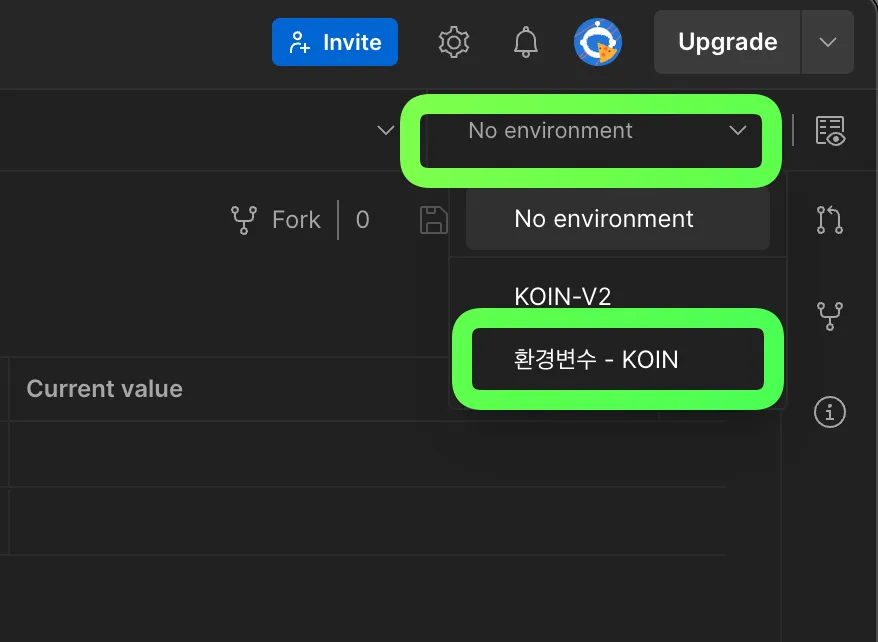 위에서 설정을 완료했다면 우측 상단에 환경변수를 선택할 수 있는 탭에 방금 선언한 값이 있는것을 확인할 수 있다. 이를 선택한다.