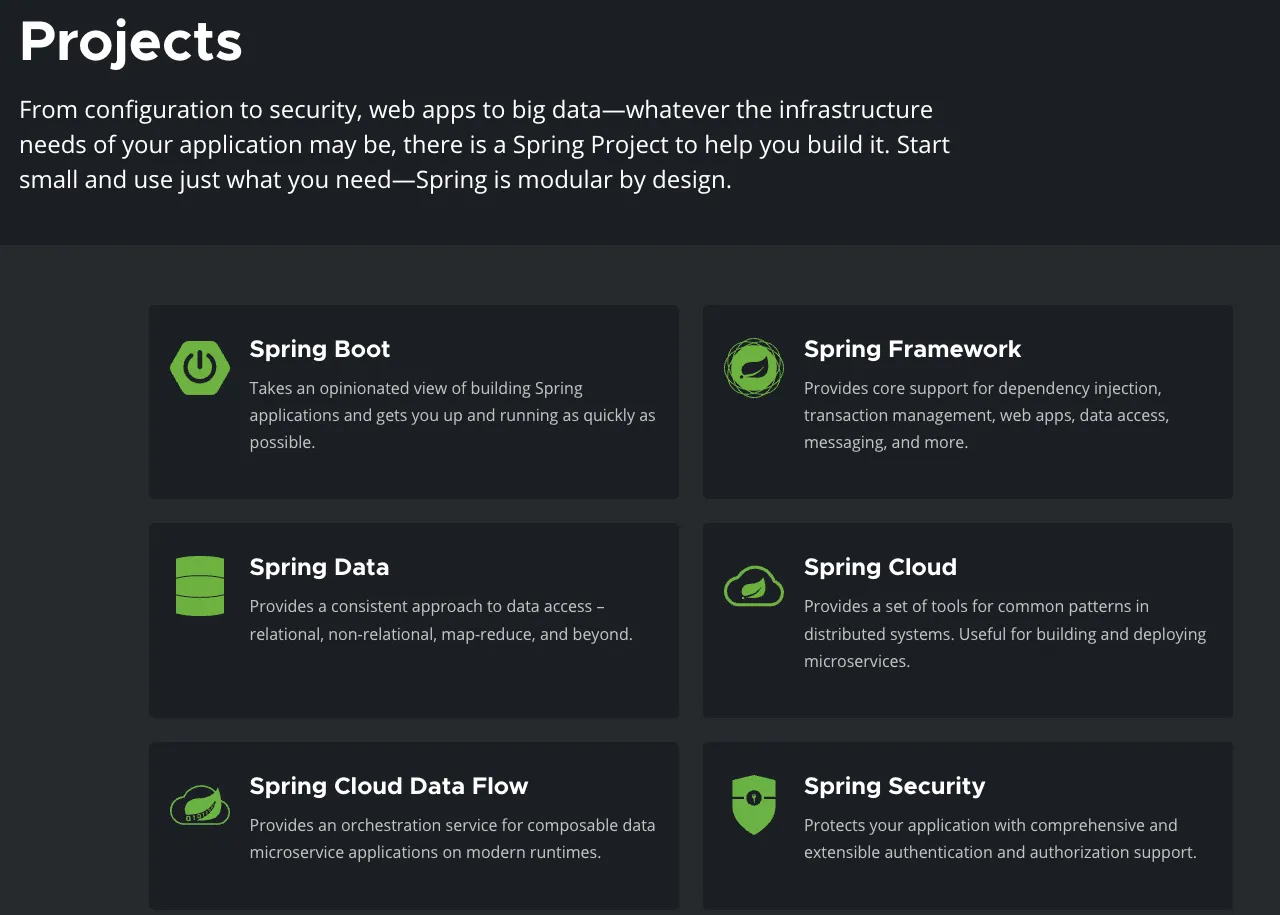 Spring Boot, Spring Framework, Spring Data, Spring Cloud 등등.. 다양한 Spring Project들이 존재한다.