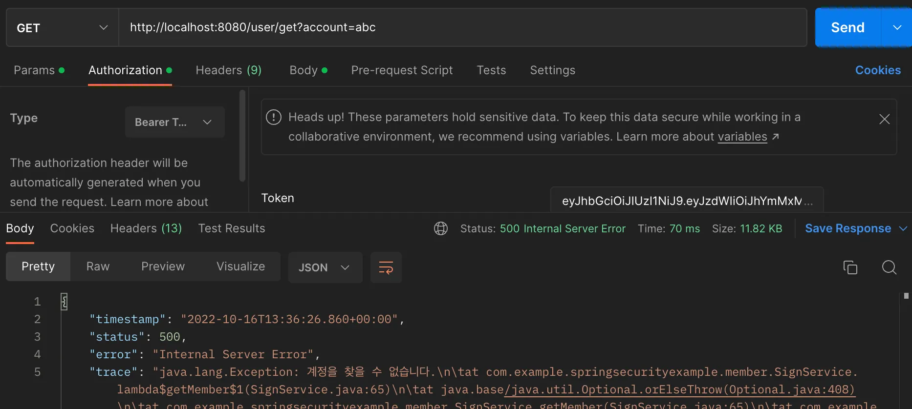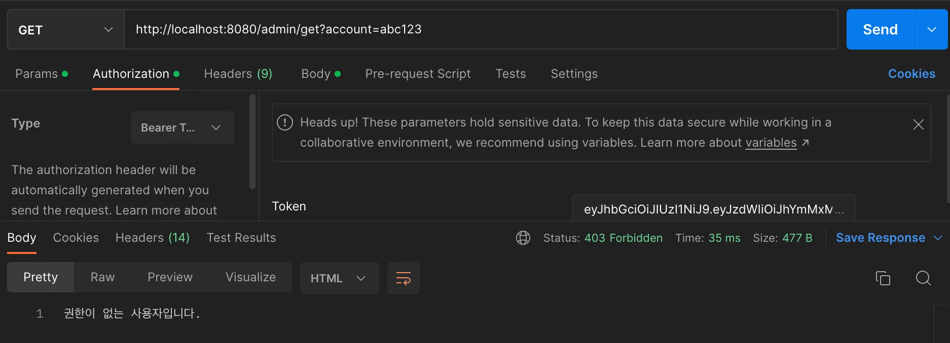 - 토큰없이 /user/get을 호출해본다.