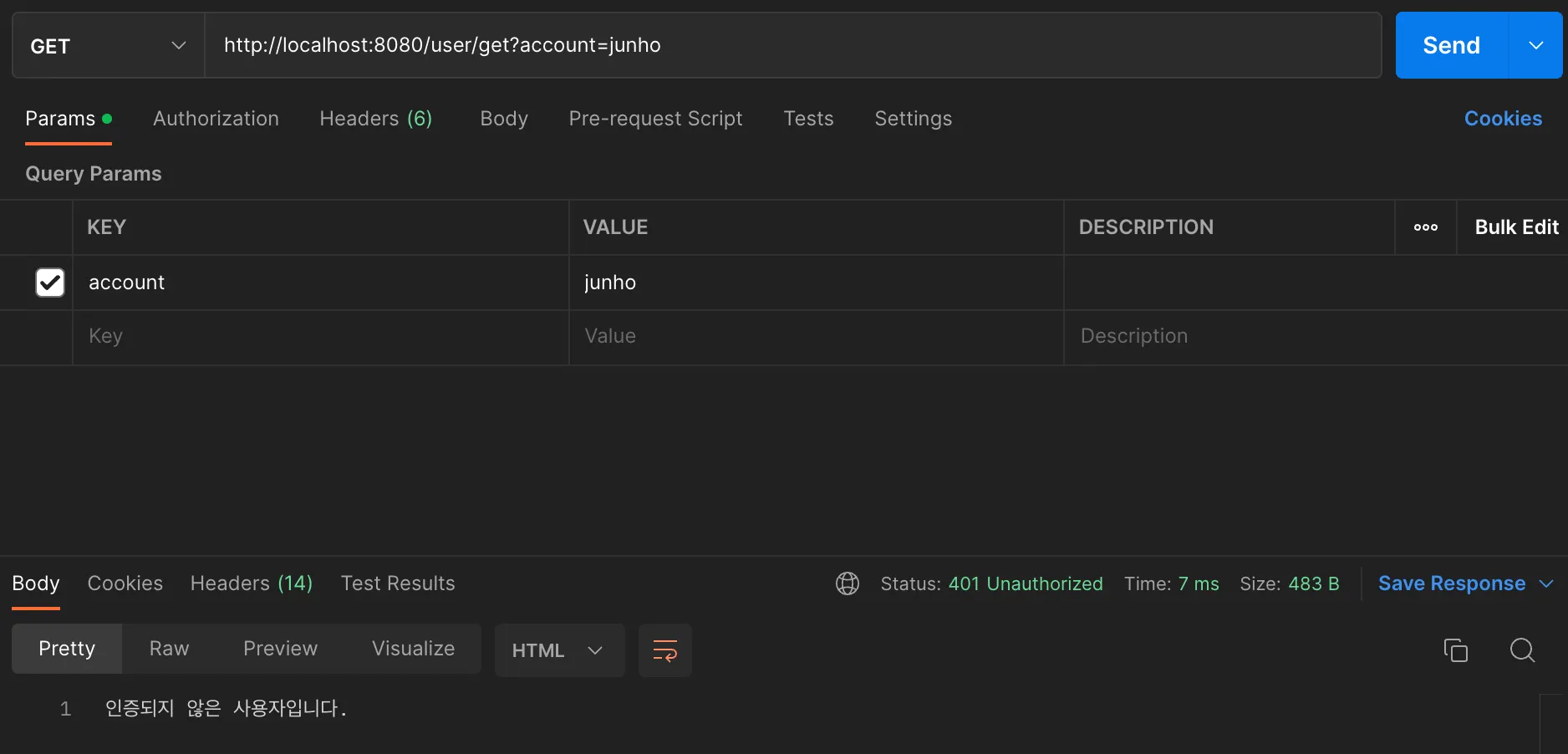 어떤 요청을 해도 “인증되지 않은 사용자입니다”를 반환한다.