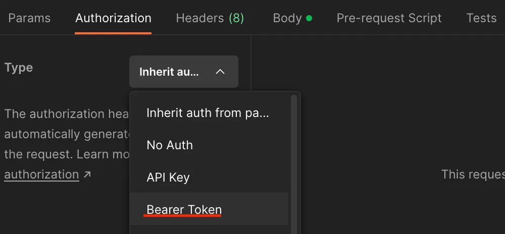 Postman에서 ‘Authorization - Type - BearerToken을 선택하고 로그인을 했을 때 발급받은 토큰값을 넣어준다.