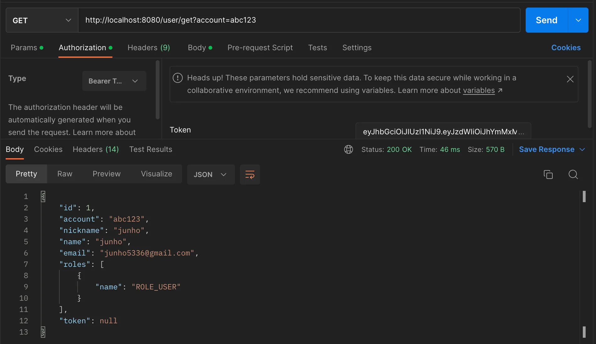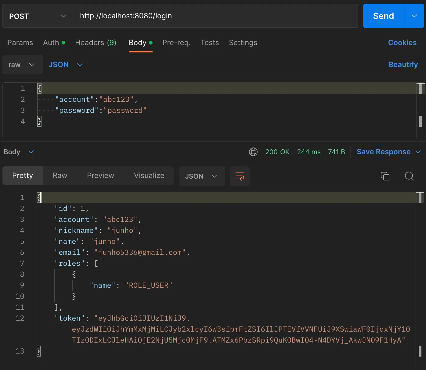 유저의 정보와 토큰이 반환된다.