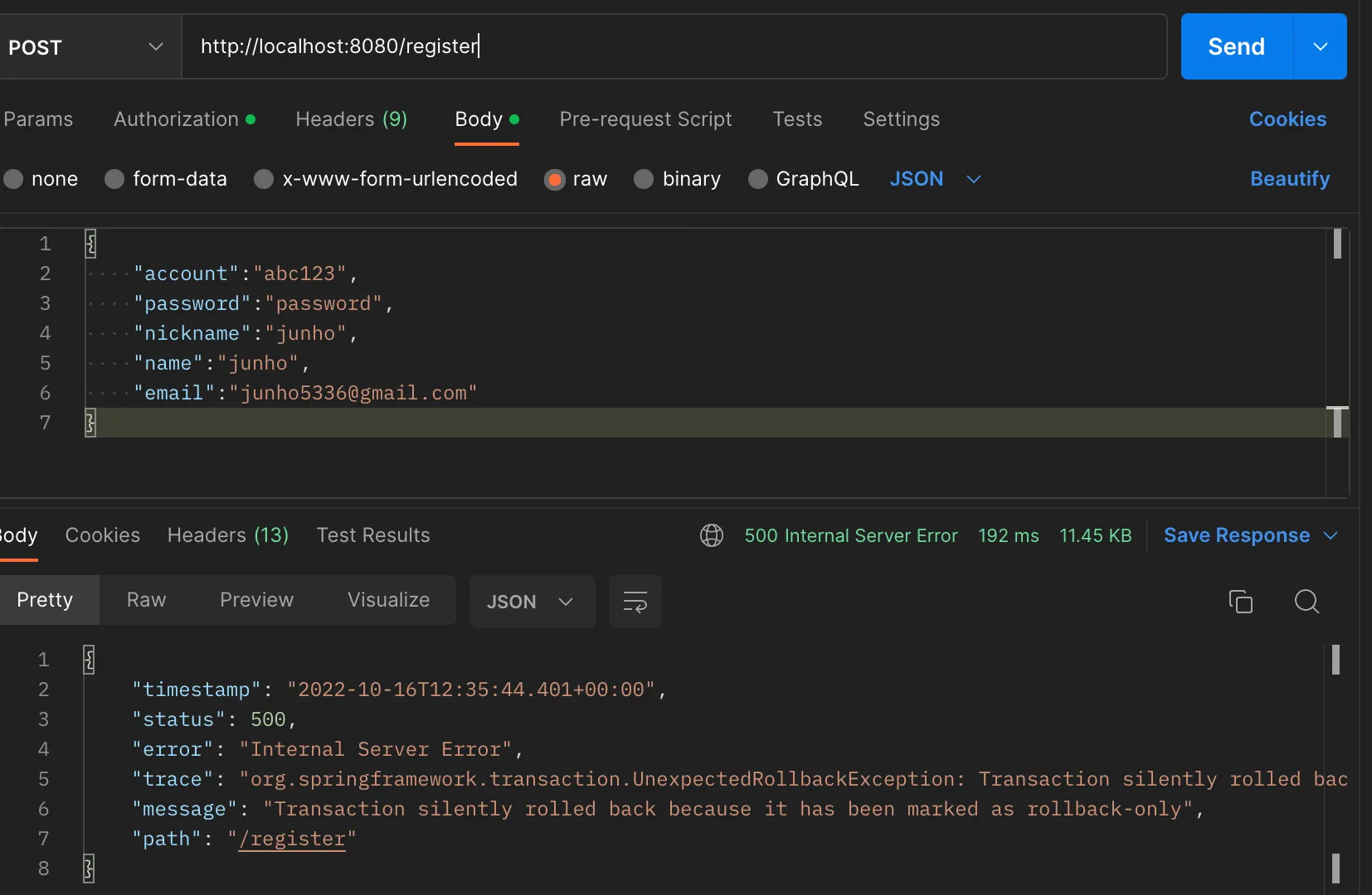 account, email 필드가 unique이기 때문에 중복 회원가입을 하면 exception이 발생한다.